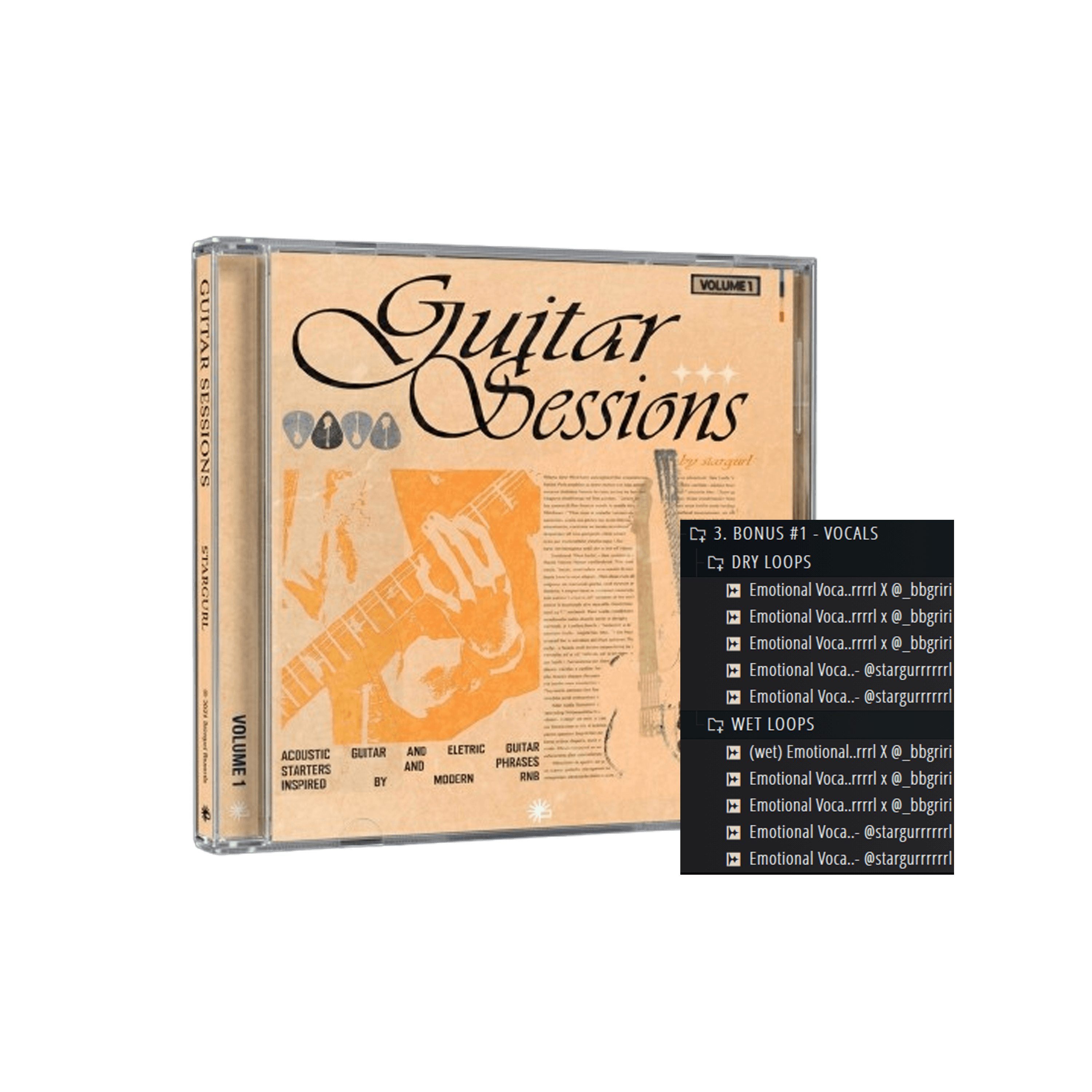 10 original vocal loops. Every vocal comes in dry and wet versions so you can blend them exactly how you want. Made specifically to sit on top of RnB guitar-based beats.